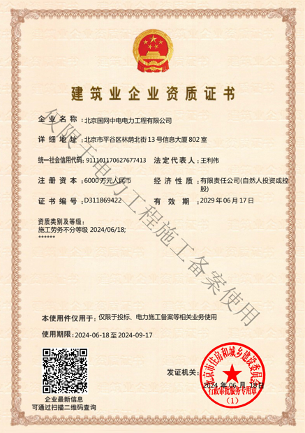 北京國網中電電力工程有限公司,已取得國家電監會頒發的《承裝(修、試)電力設施許可證》、為電力施工承裝四級、承修四級、承試四級企業。北京市住房和城鄉建設委員會頒發的房屋建筑施工總承包二級、機電設備安裝工程專業承包二級、輸變電專業承包二級、城市及道路照明工程專業承包二級、市政公用工程總承包二級資質、勞務不分等級,已通過ISO9001:2015 GB/T50430-2017質量管理體系、GB/T24001-2016/ISO 14001:2015環境管理體系、